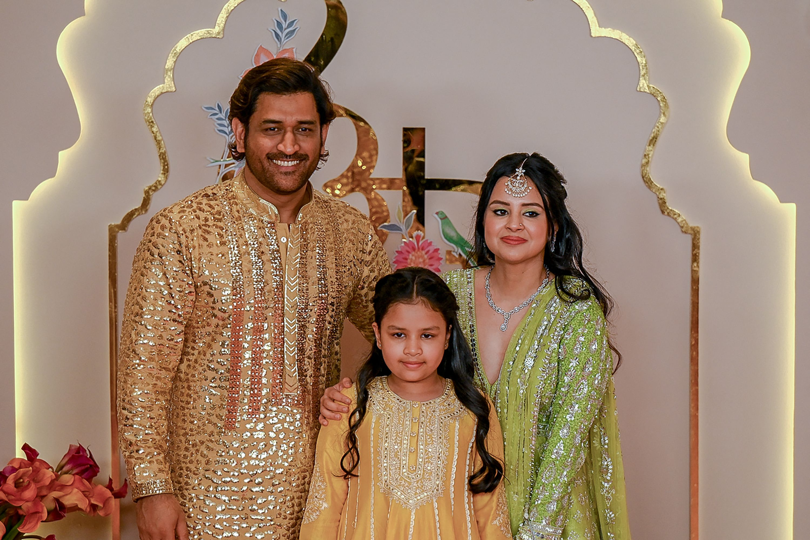 Ex-jogador de cricket,Mahendra Singh Dhoni leva a família para megacasamento — Foto: AFP
