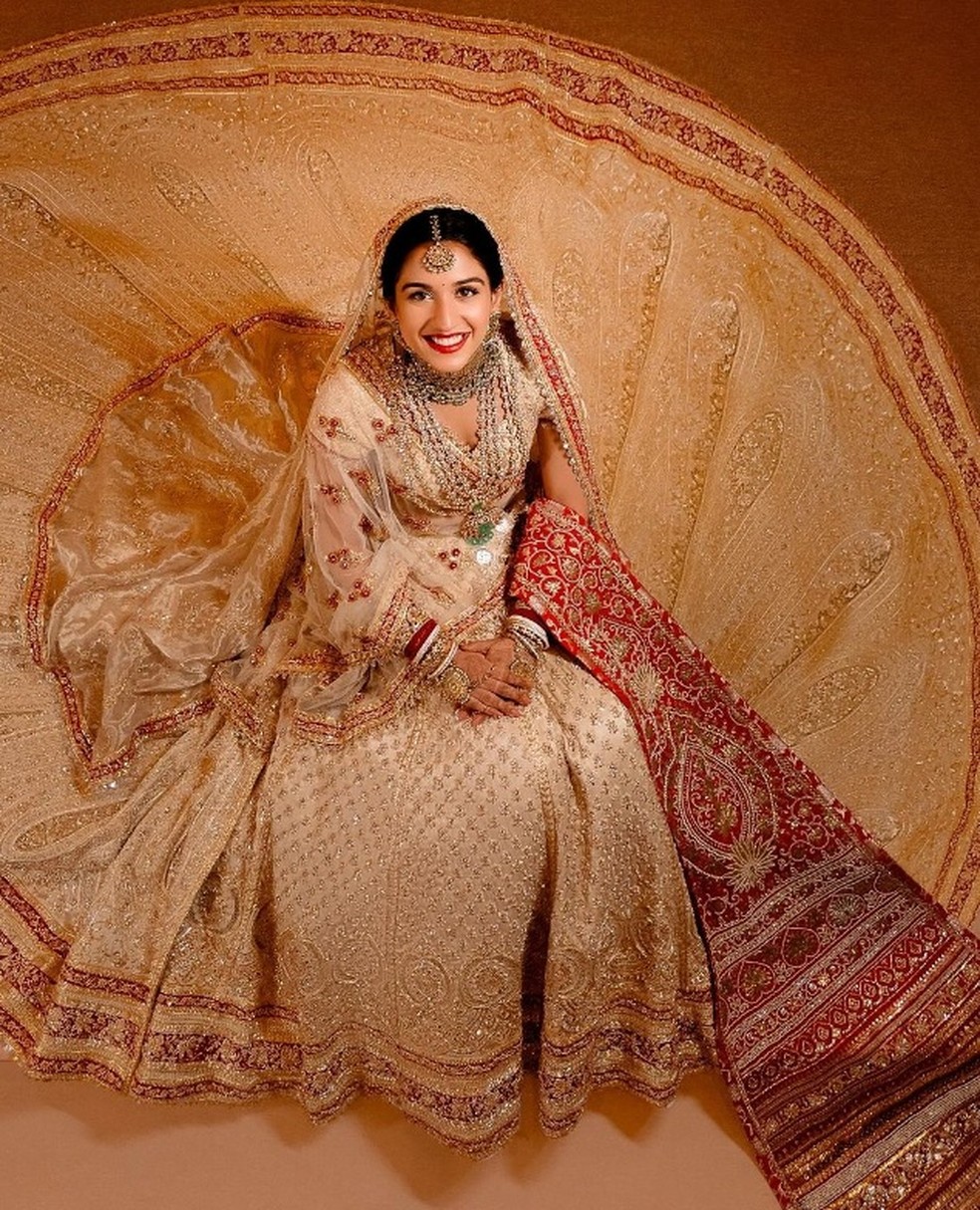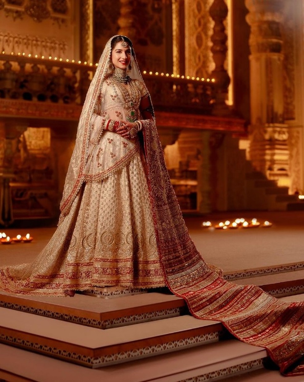 As saias são geralmente decoradas com bordados,pedrarias e trabalhos em ouro e prata.) toda bordada à mão,com uma dupatta dupla (longo lenço semelhante a um xale tradicionalmente usado por mulheres no subcontinente indiano para cobrir a cabeça e os ombros). O véu tem 5 metros de tecido.