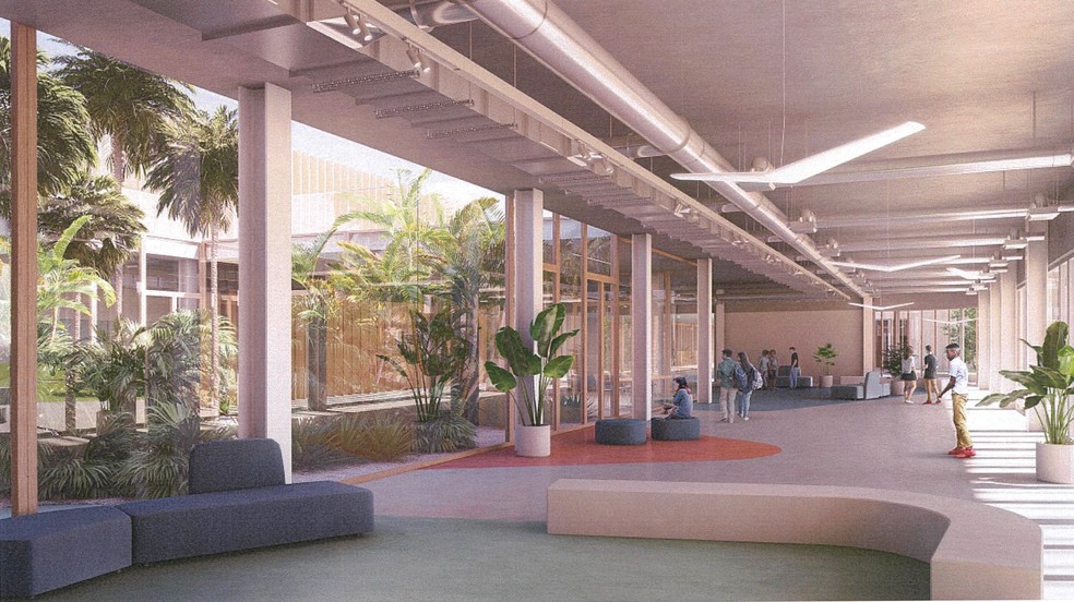 Simulação mostra como serão os corredores do colégio — Foto: Reprodução