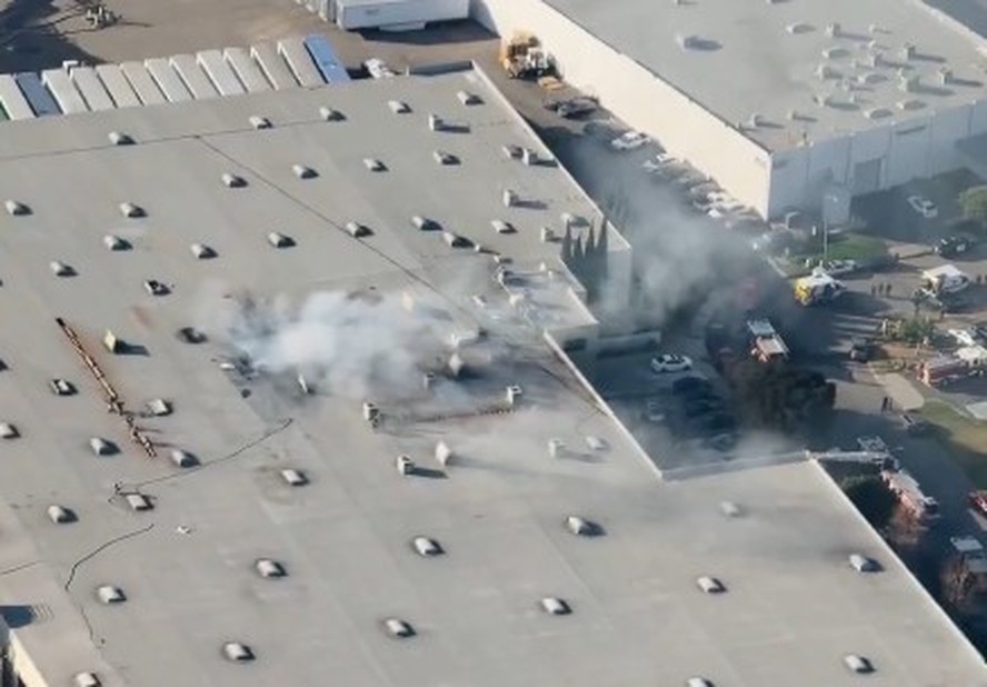 Avião de pequeno porte cai sobre galpão de fábrica,em Fullerton,a cerca de 40 quilômetros de Los Angeles — Foto: Reprodução / redes sociais