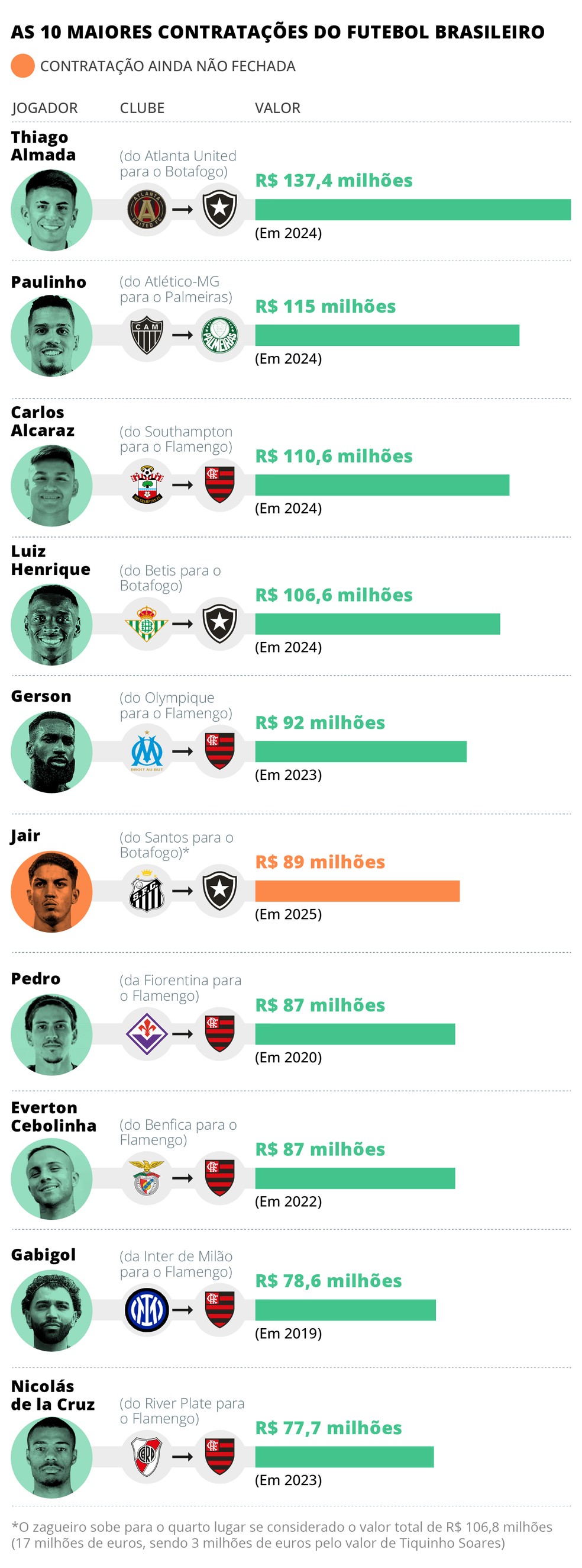 Um jovem zagueiro de apenas 19 anos e quase dois metros de altura está próximo de se tornar uma das maiores contratações do futebol brasileiro ao lado de nomes mais badalados e consagrados,como Luiz Henrique,Thiago Almada,Paulinho e Gabigol,entre outros. Novo sonho — e quase realidade — do Botafogo,Jair deve deixar o Santos por 14 milhões de euros (R$ 89 milhões,na cotação atual),contabilizando o bônus (2 milhões de euros). O valor o coloca no Top-10 das negociações nacionais. Se for considerada a avaliação do atacante Tiquinho Soares (3 milhões de euros),que será cedido ao clube santista,o total sobe para 17 milhões de euros (cerca de R$ 108 milhões),e ele figuraria em quarto lugar no ranking,atrás de Almada,Paulinho e Alcaraz.