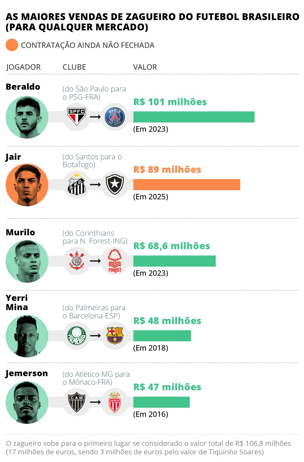 A venda de Jair também será a segunda maior negociação de um zagueiro do futebol brasileiro para qualquer mercado. Os R$ 89 milhões estão atrás apenas dos R$ 100 milhões da venda de Beraldo do São Paulo para o PSG (que podem ser superados,em reais,se considerarmos os 17 milhões de euros envolvidos na transação).