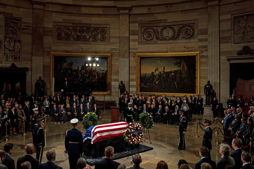Na sequência,o pessoal militar transferiu o caixão envolto na bandeira americana até a Rotunda do Capitólio,onde permanecerá rodeado por uma guarda de honra até as 7h (5h em Brasília) de quinta-feira.