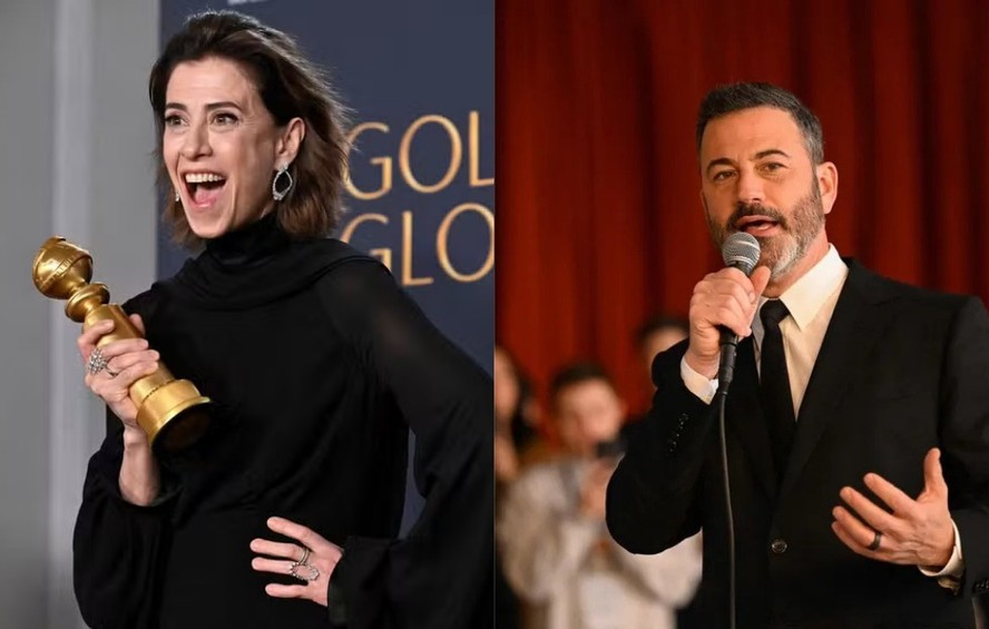 Fernanda Torres e Jimmy Kimmel — Foto: Robyn Beck/AFP e Patrick T. Fallon/AFP