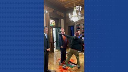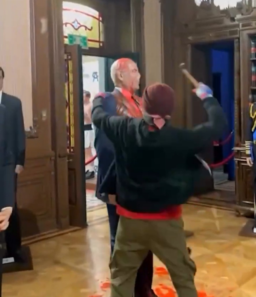 Captura de tela de vídeo mostra momento em que homem golpeia com martelo estátua de cera do primeiro-ministro de Israel,Benjamin Netanyahu — Foto: Reprodução/Redes Sociais