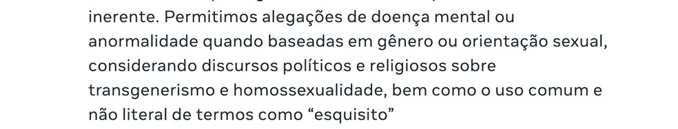 O trecho em português das diretrizes da Meta que trata das associações de pessoas LGBTQIAPN+ com transtornos mentais afirma que a empresa permite "alegações de doença mental ou anormalidade quando baseadas em gênero ou orientação sexual,considerando discursos políticos e religiosos sobre transgenerismo e homossexualidade,bem como o uso comum e não literal de termos como “esquisito”'.