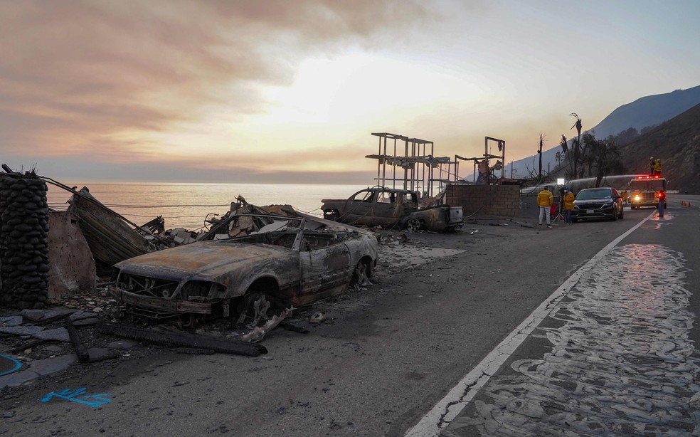 Carcaças de veículos consumidos pelo fogo se espalham ao longo da Pacific Coast Highway,Califórnia — Foto: Cecilia Sanchez / AFP