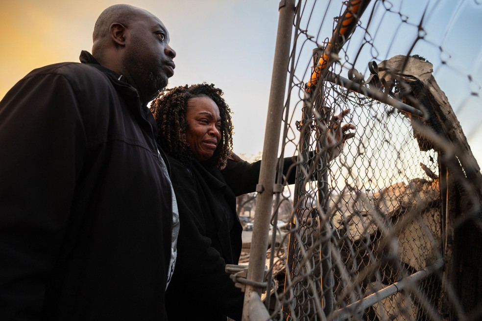 Casal se desespera ao chegar ao endereço onde ficava sua residência em Altadena,Califórnia — Foto: Zoë Meyers / AFP