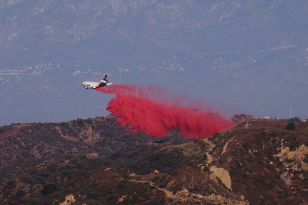 Aviões lançam produtos retardantes de fogo,enquanto o incêndio cresce nas montanhas impulsionado pelo vento,em Topanga,Califórnia — Foto: David Swanson / AFP