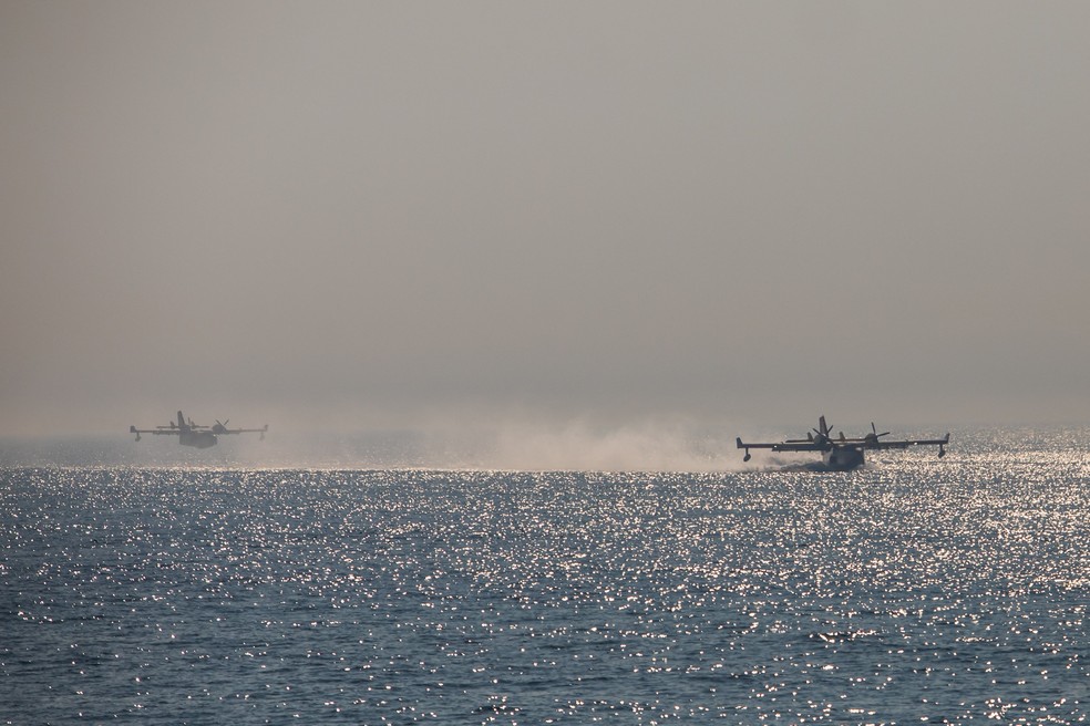 Aviões-tanque pegam água do oceano para combater o incêndio no bairro Pacific Palisades,Califórnia — Foto: Apu Gomes/Getty Images/AFP