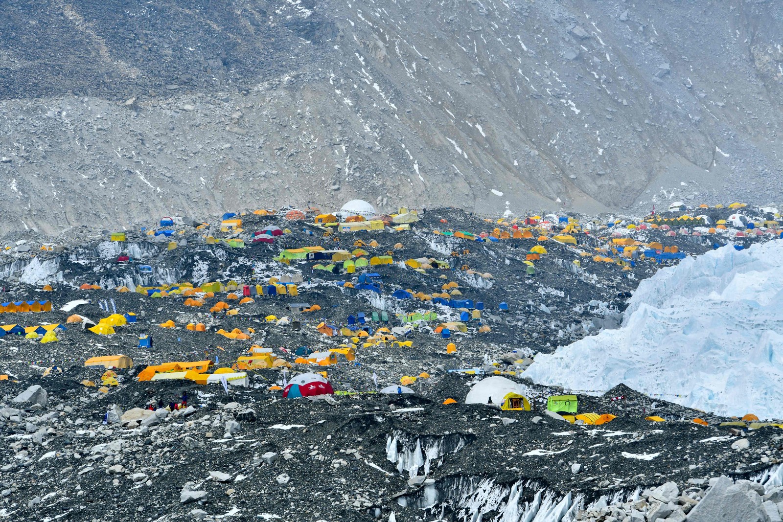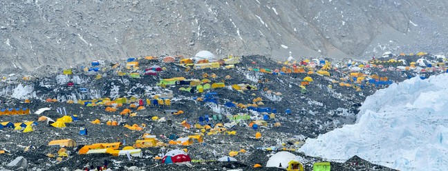 Tendas fluorescentes,equipamento de escalada descartado,botijões de gás vazios e até excrementos humanos cobrem o caminho trilhado até o cume — Foto: Prakash Mathema/AFP