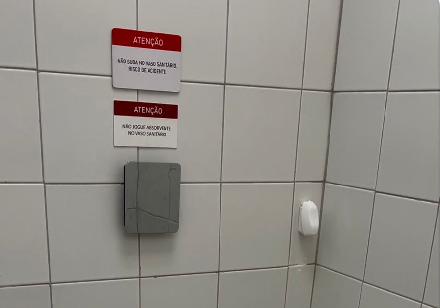 Jornalistas e influenciadores puderam ver,na noite da última sexta-feira,esse detalhe do pequeno cômodo todo branco,que tem uma privada,uma pequena pia,uma lixeira,uma ducha higiênica,um odorizador de ambiente preso na parede e um acessório para apoios dos pés localizado na frente do vaso.