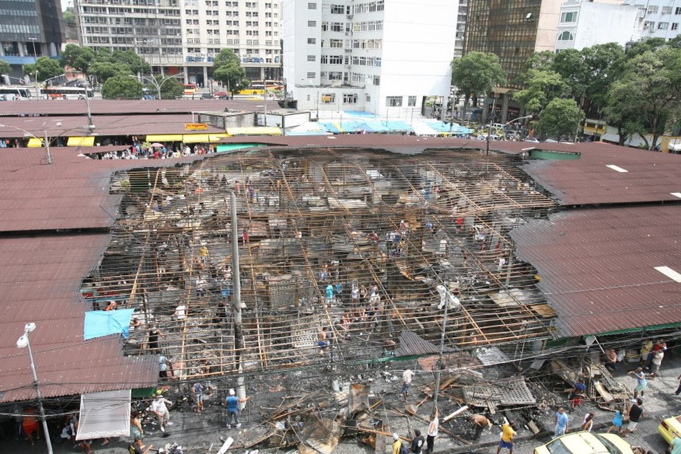 No incêndio deste domingo,a fumaça pôde ser vista até por quem estava em bairros vizinhos. Ninguém ficou ferido. O prefeito Eduardo Paes esteve no local e prometeu ajudar os lojistas e reconstruir o espaço. A Subsecretaria municipal de Defesa Civil informou que todo o mercado está interditado e que não abrirá hoje. Mais de 60 militares de dez quartéis do Corpo de Bombeiros atuaram combatendo as chamas,que começaram por volta das 10h. O foco,que atingiu uma área de 40 metros quadrados perto do cruzamento da Rua dos Andradas com Senhor dos Passos,foi controlado em 20 minutos. Mas o rescaldo levou mais de três horas. A entrada da estação de metrô da Uruguaiana precisou ser fechada por causa da fumaça.