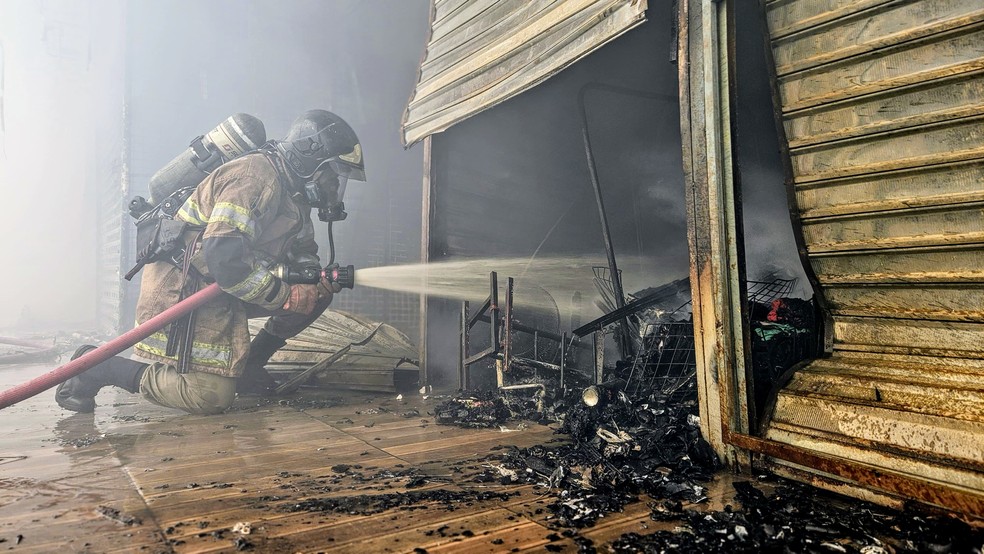 Bombeiro combate o incêndio e um dos boxes do Camelódromo da Uruguaiana: local já passou por outros sinistros semelhantes — Foto: Angela Goes/CBMERJ