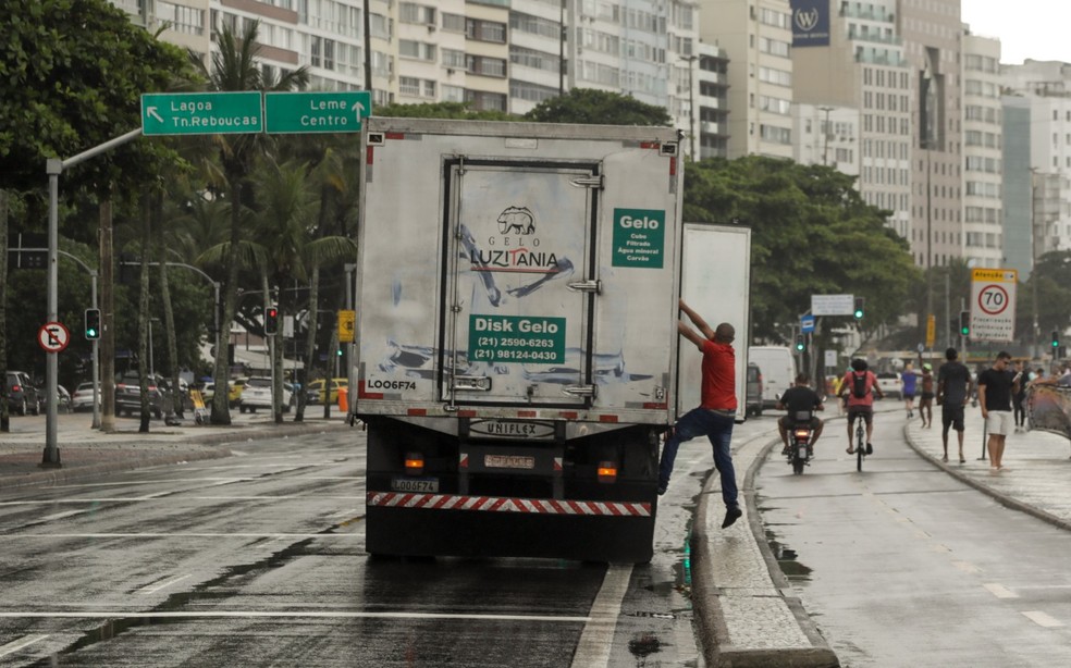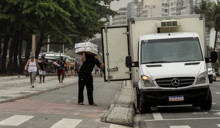Veículo faz entrega de gelo para um quiosque na altura da Rua Figueiredo Magalhães — Foto: Gabriel de Paiva/Agência O Globo