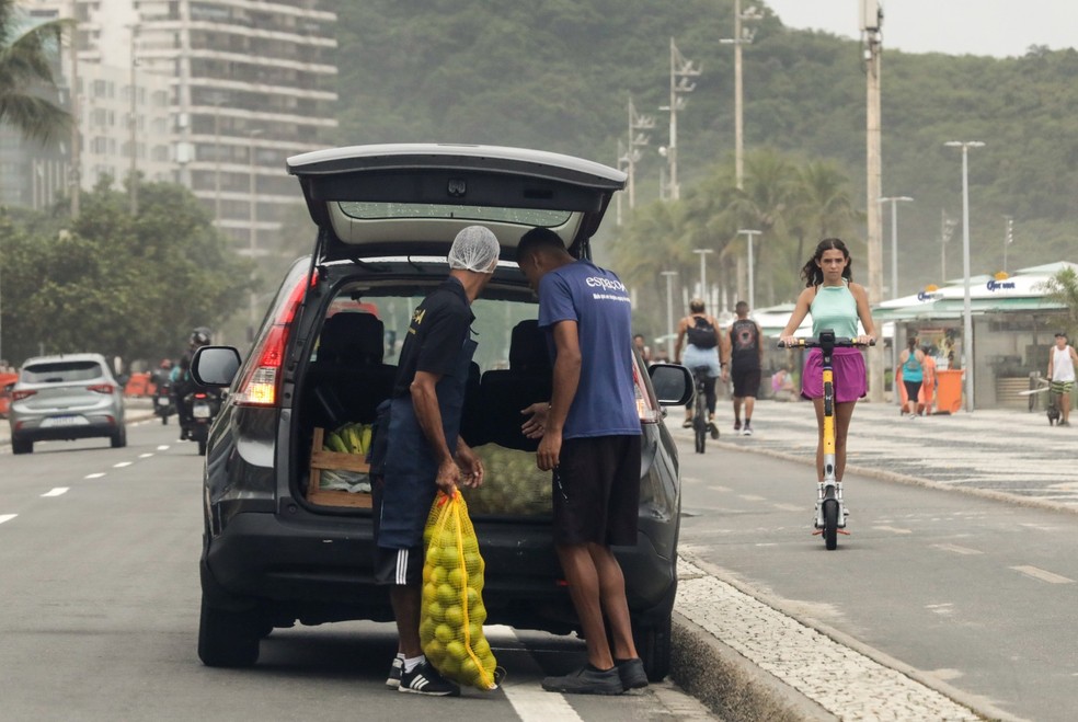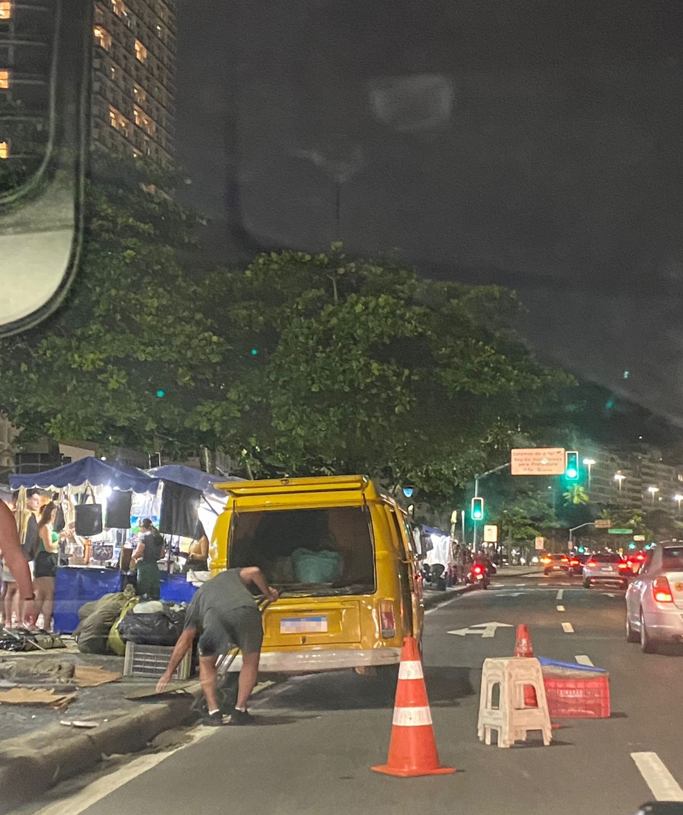 Mas são os problemas de ordem urbana que saltam aos olhos. Em apenas 16 minutos — das 9h32 às 9h48 — cinco veículos com placas pouco legíveis foram flagrados descarregando mercadorias para quiosques em horário e locais proibidos: um caminhão de gelo,nas proximidades da Rua Miguel Lemos; duas vans com mantimentos,perto da Rua Siqueira Campos; uma van frigorífica,nas imediações da Rua Duvivier; e um automóvel,com laranjas e bananas,na direção da Rua Antônio Vieira. Todos estavam na pista sentido Leme.