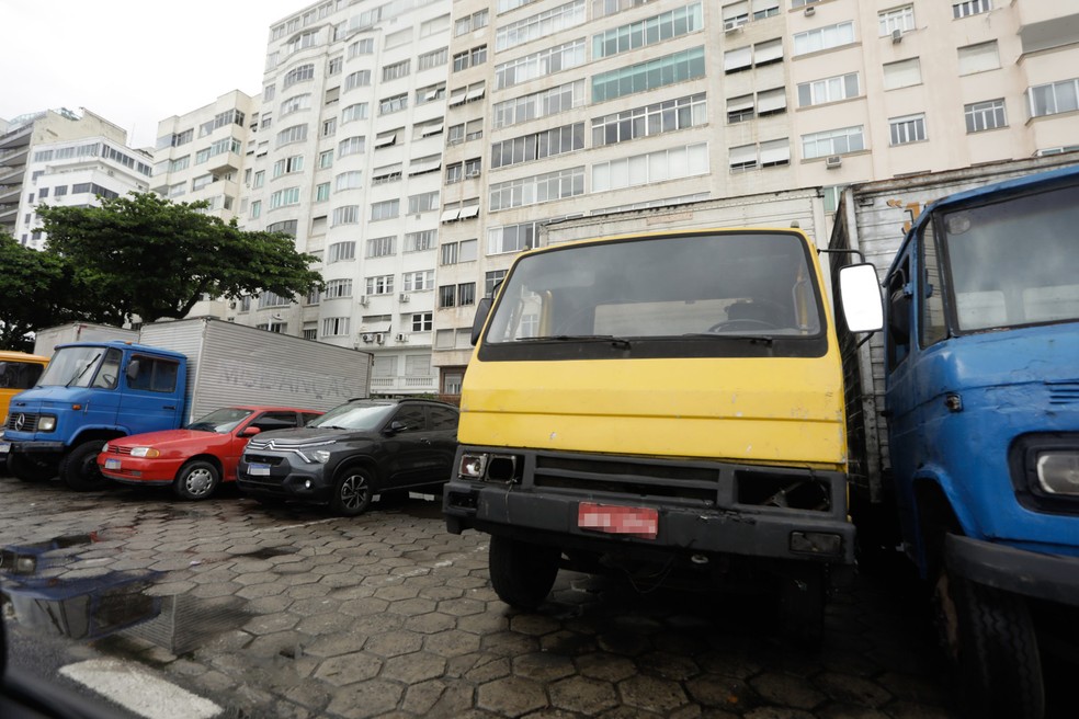 Caminhões que servem de depósito,sem talão de estacionamento,estacionados no trecho entre as ruas Djalma Ulrich e Almirante Gonçalves — Foto: Gabriel de Paiva/Agência O Globo