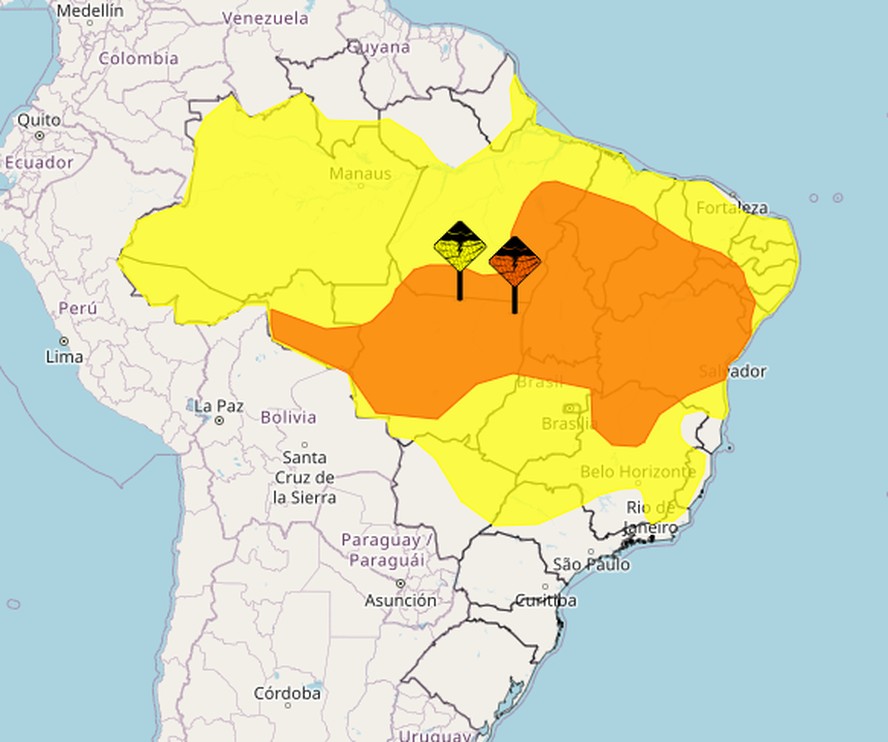 O Instituto Nacional de Meteorologia (Inmet) lançou dois alertas de chuvas intensas para esta segunda-feira. Os avisos encobrem 23 estados e Distrito Federal e correspondem a baixa intensidade,sendo um de "Perigo Potencial" na cor amarela,e média intensidade,de "Perigo",na cor laranja. A região Sul do país não será impactada pela instabilidade.