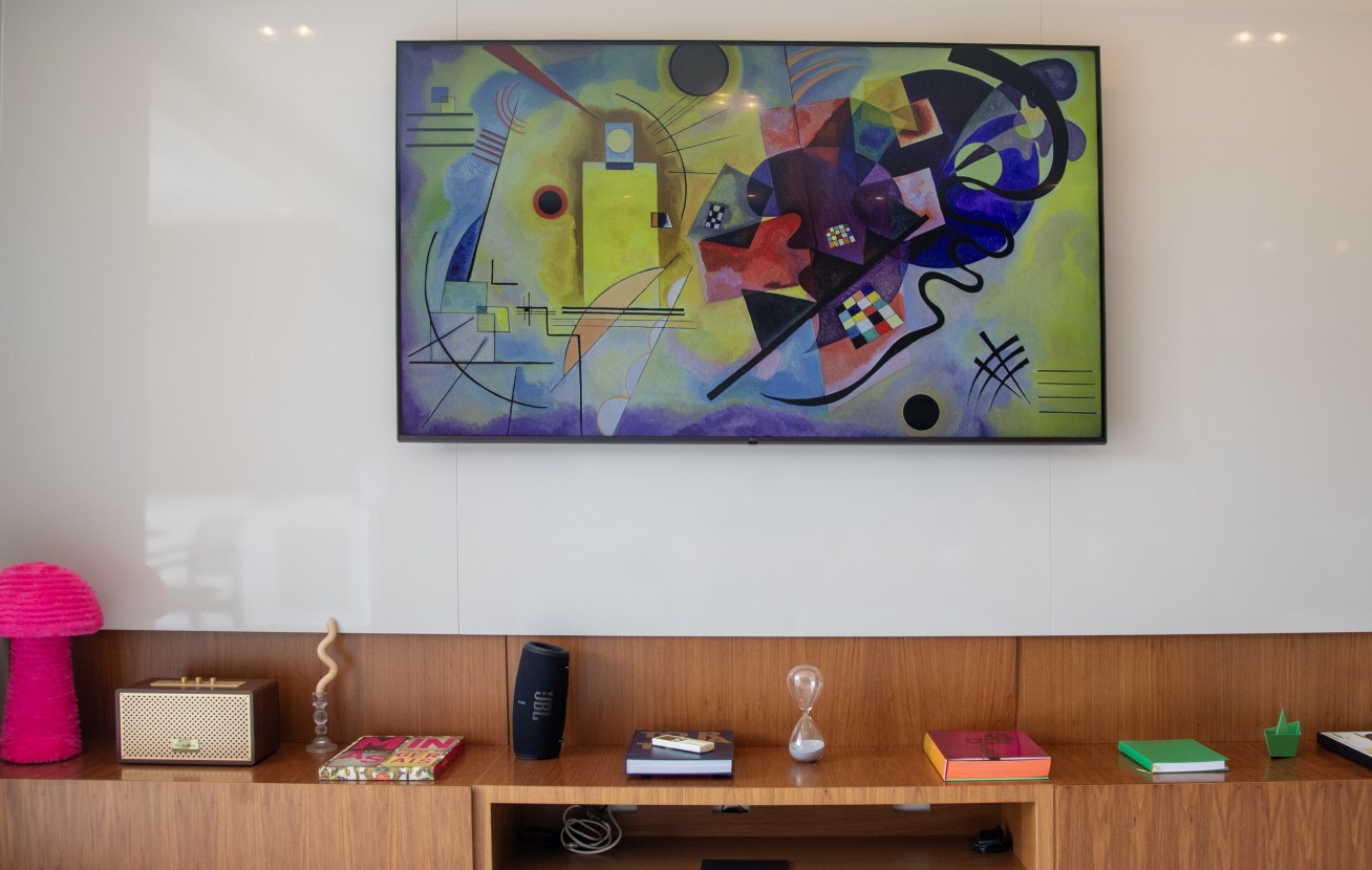 Vitória Strada usa seus desenhos para decorar o apartamento — Foto: Ana Branco/Agência O Globo
