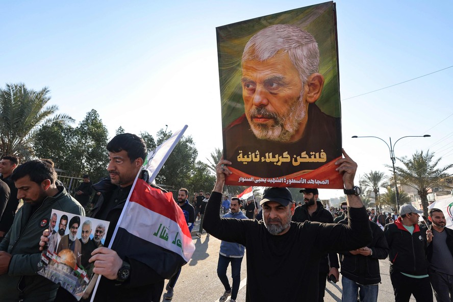 Homem carrega pôster do líder palestino do Hamas,Yahya Sinwar,durante comício na área de Shula,a oeste de Bagdá — Foto: AHMAD AL-RUBAYE / AFP