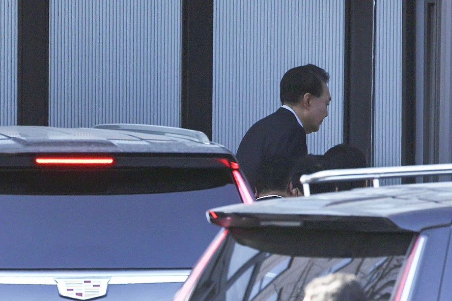 O presidente afastado Yoon Suk Yeol chega ao Escritório de Investigação de Corrupção para Altos Funcionários,após ser preso nesta quarta-feira — Foto: KOREA POOL / AFP