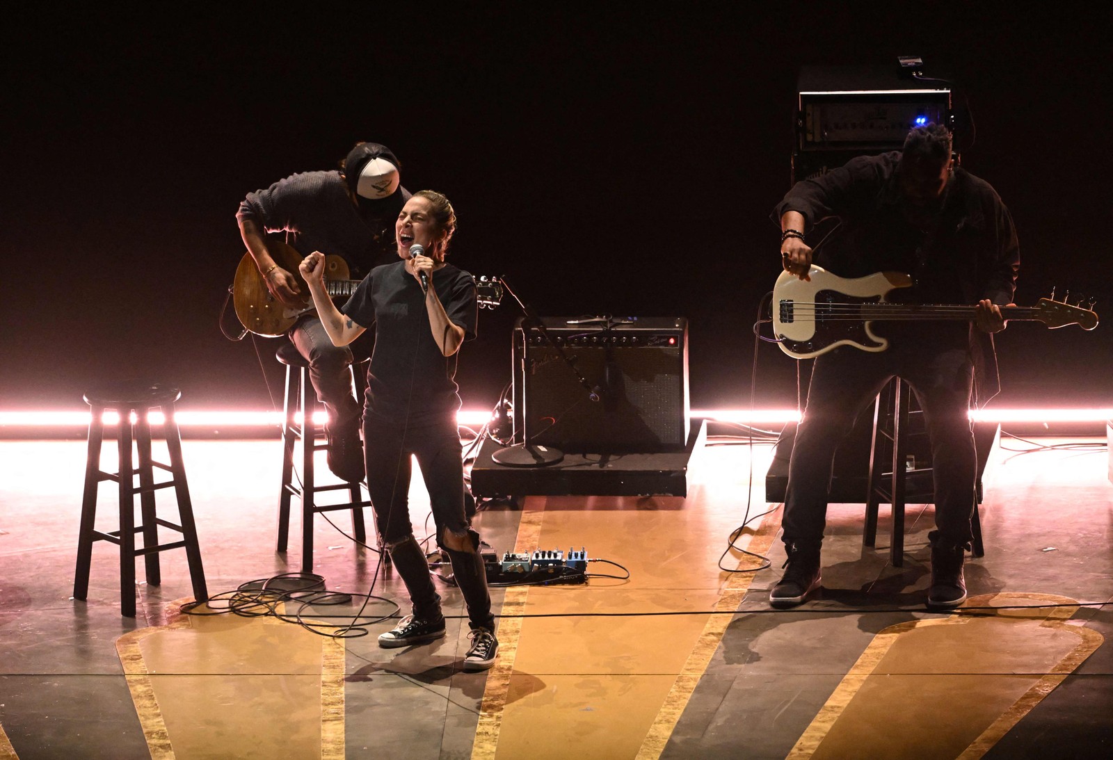 Lady Gaga cantando 'Hold My Hand',composta por ela para o longa 'Top Gun: Maverick' — Foto: Patrick T. Fallon / AFP