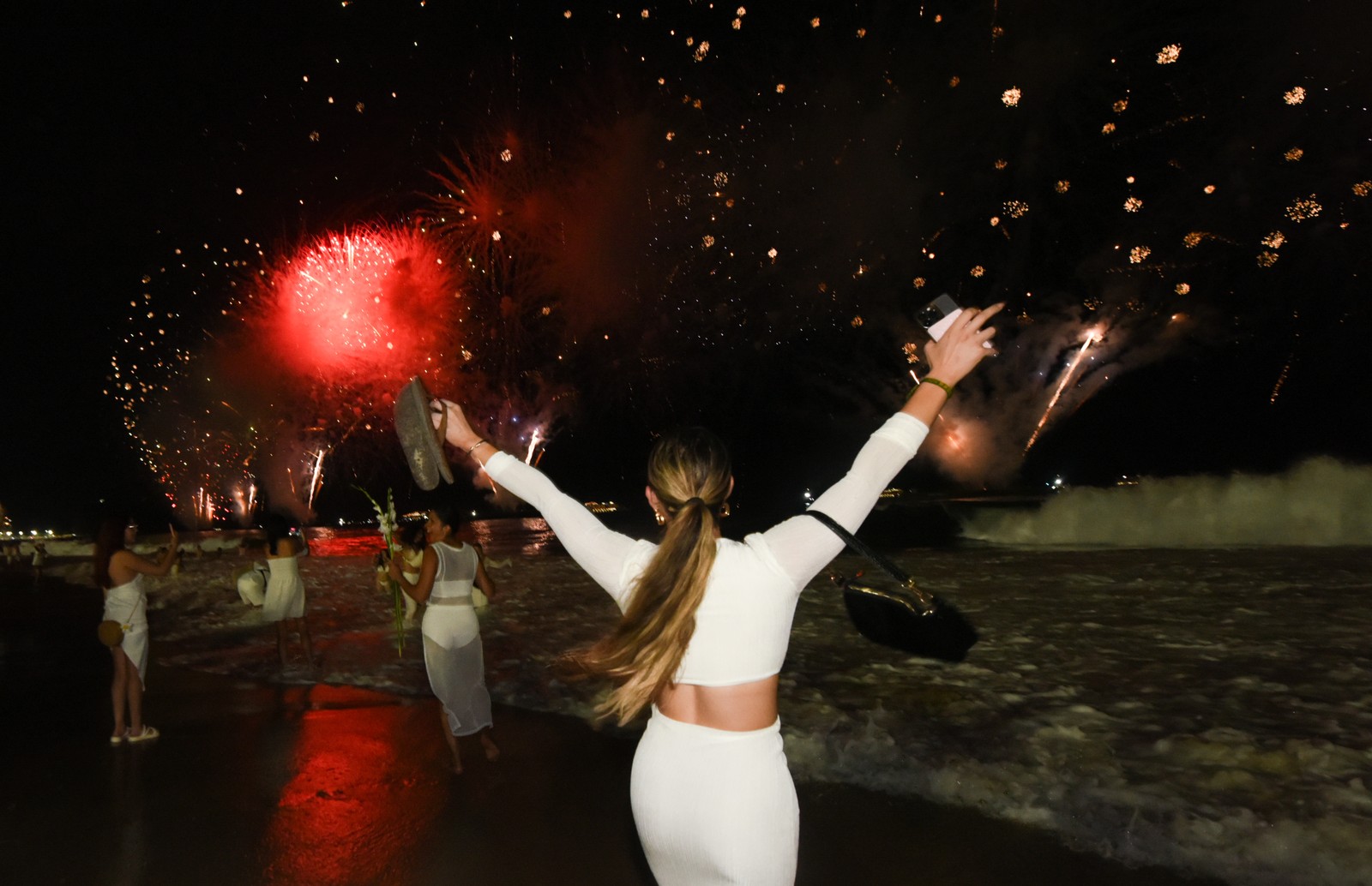 De branco,mulheres celebram a virada do ano sob os fogos de Copacabana — Foto: Divulgação/ Alex Ferro | Riotur