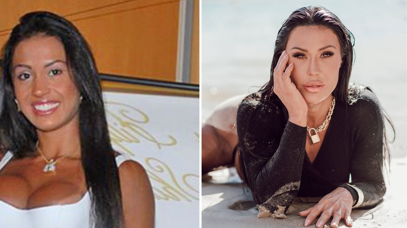 Gracyanne Barbosa mudou bastante o corpo ao longo dos anos. Ela já realizou preenchimento de queixo para alongar o rosto,harmonização facial e preenchimentos com ácido hialurônico. Com o passar do tempo,a musa fitness reverteu alguns deles — Foto: Reprodução/internet e Tiago Brov.
