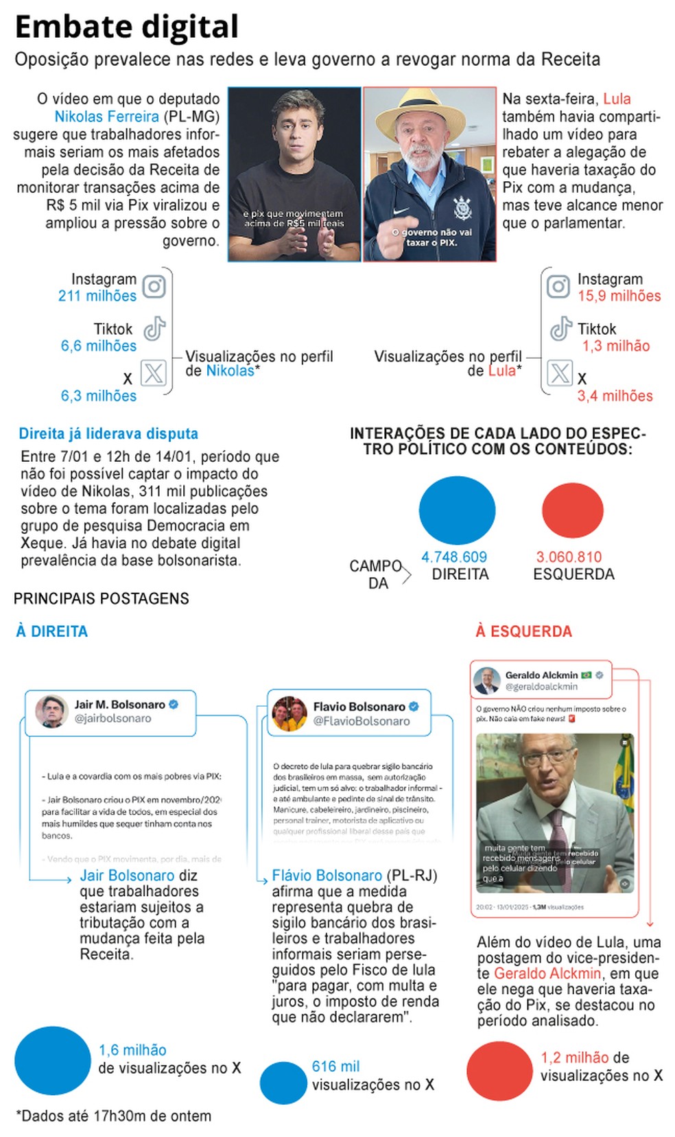 Em meio a troca de comando na comunicação,o governo Lula sofreu uma dura derrota nas redes sociais,justamente a área apontada como gargalo pelo presidente e pelo novo chefe da área,Sidônio Palmeira. A repercussão negativa da norma da Receita Federal que ampliava a fiscalização em transações financeiras como o Pix,que levou a um recuo na quarta-feira do Planalto,foi alavancada nas plataformas digitais com o vídeo do deputado federal Nikolas Ferreira (PL-MG),que conseguiu atingir perfis de fora do campo da direita. A prevalência da oposição no debate sobre o tema já era uma tendência nas redes sociais nos últimos dias.