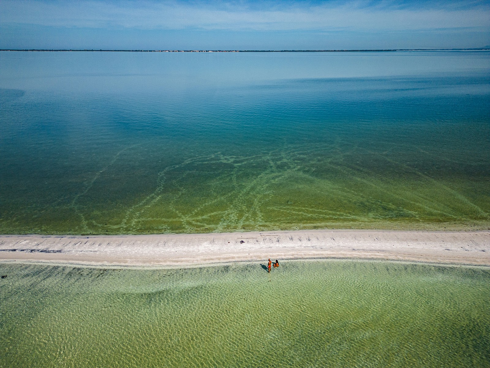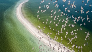 Caminho de areia em meio às águas surge em Arubinha em momentos do dia de maré baixa — Foto: Hermes de Paula / Agência O Globo