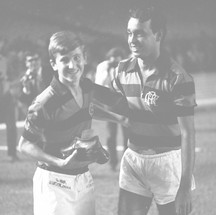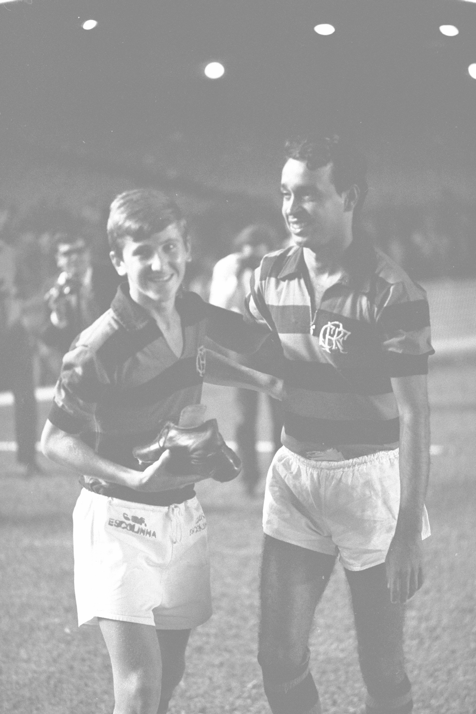 Em uma das cenas mais famosas da história do Flamengo,Carlinhos,o Violino,dá suas chuteiras à Zico,que assumiria sua camisa 10 — Foto: Agência O Globo