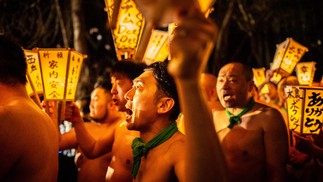 Quando o festival atingiu o seu auge,centenas de homens aglomeraram-se dentro do templo de madeira grita — Foto: Philip Fong/AFP