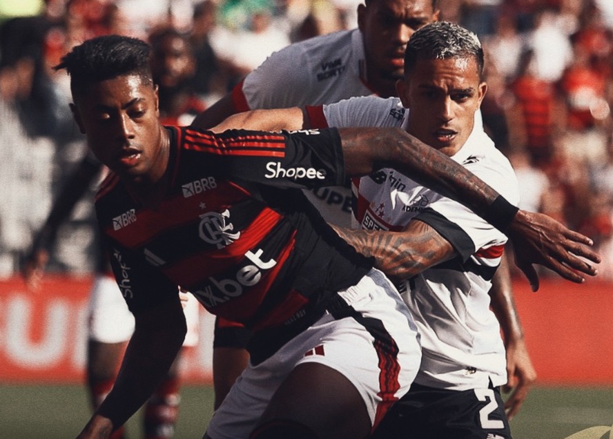 O São Paulo também assustou o Flamengo na segunda metade da primeira etapa. Calleri obrigou Rossi a fazer grande defesa em cabeçada que pareceu um tiro. Jandrei também fez outra grande defesa em cabeçada de Alcaraz.