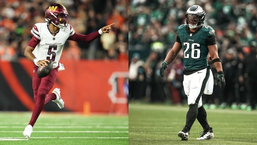 Jayden Daniels,camisa cinco do Washington Commanders e Saquon Barkley,camisa 26 do Philadelphia Eagles — Foto: Reprodução