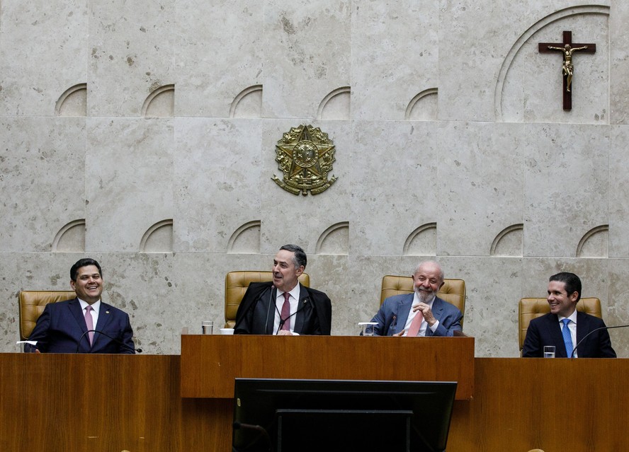 Da esquerda para a direita: os presidentes do Senado,Davi Alcolumbre (União Brasil-AP); do STF,Luís Roberto Barroso; do Brasil,Luiz Inácio Lula da Silva (PT) e o da Câmara,Hugo Motta (Republicanos-PB) — Foto: Brenno Carvalho/O Globo