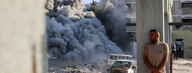 Um homem se protege atrás de uma coluna enquanto uma explosão propaga fumaça e poeira durante um ataque israelense que supostamente teve como alvo uma escola no distrito de Zeitoun,nos arredores da Cidade de Gaza,em 1º de setembro de 2024 — Foto: Omar AL-QATTAA / AFP