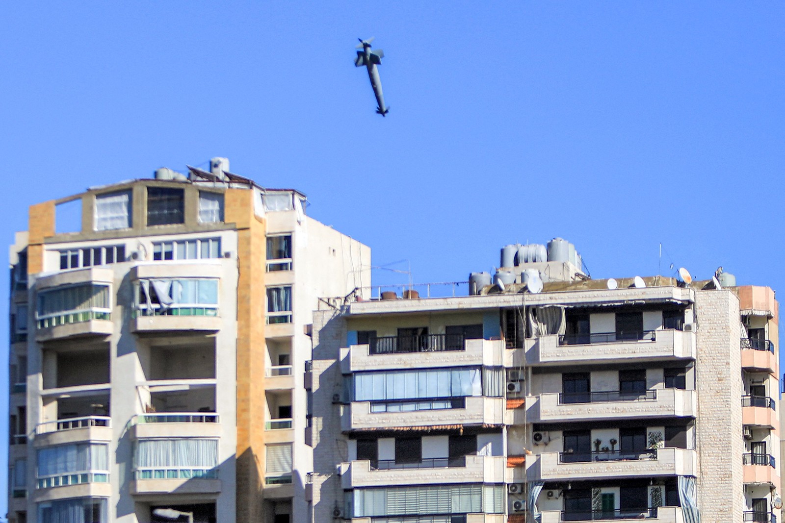 Um foguete disparado por um avião de guerra israelense se aproxima de um prédio no subúrbio de Shiyah,no sul de Beirute,em 22 de outubro,em meio à guerra em curso entre Israel e o Hezbollah — Foto: AFP