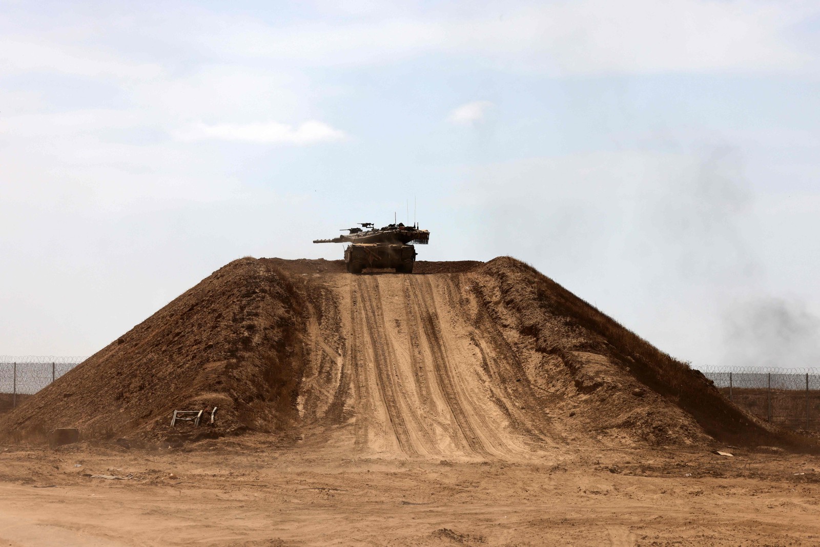 Um tanque israelense está estacionado no topo de um monte de areia perto da fronteira com a Faixa de Gaza em 2 de maio de 2024,em meio ao conflito em curso no território palestino entre Israel e o grupo militante Hamas. — Foto: Menahem KAHANA / AFP