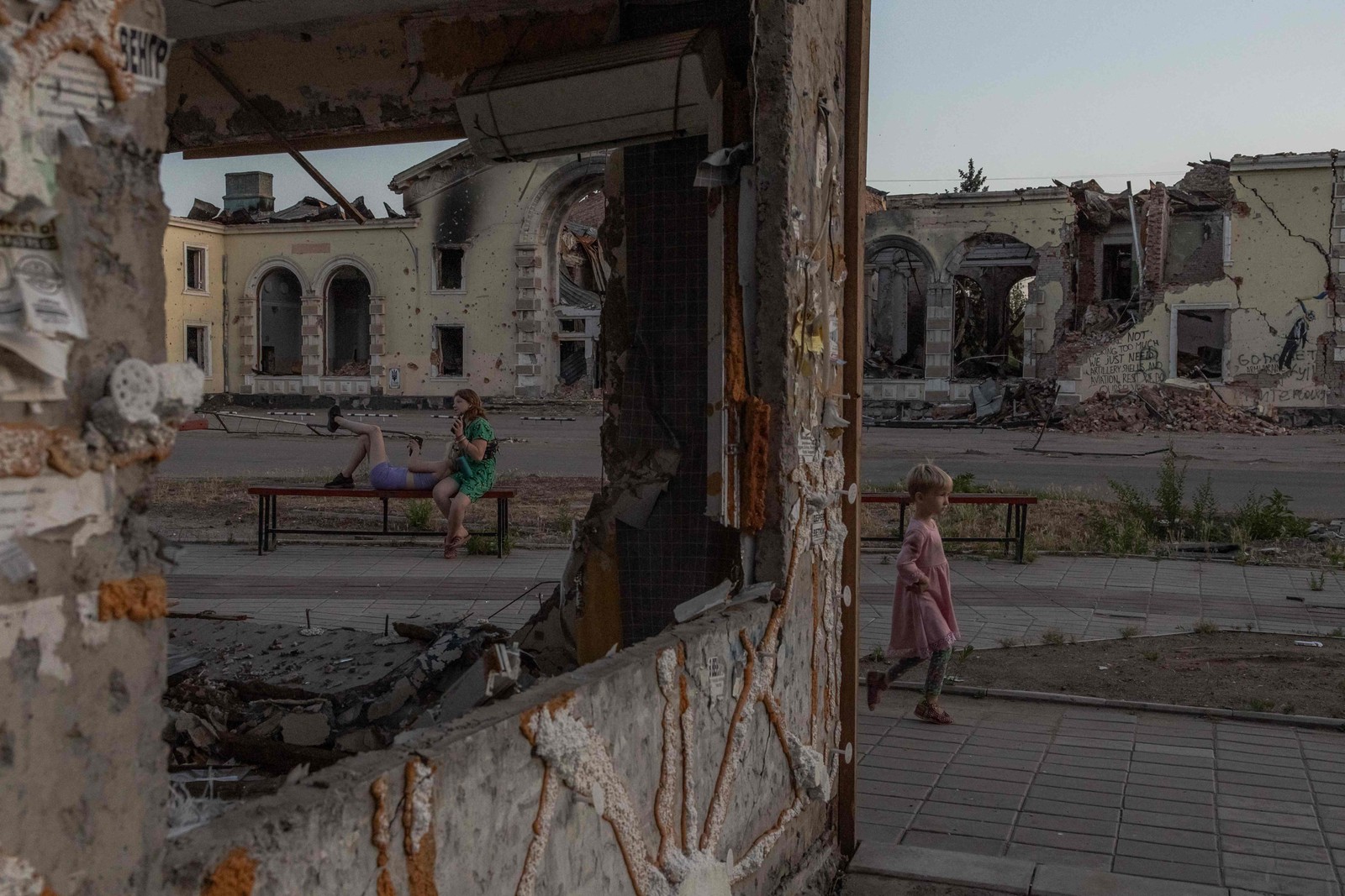 Uma criança brinca enquanto mulheres descansam em um banco em frente a edifícios residenciais destruídos por bombardeios em Kostyantynivka,região leste de Donetsk,em 22 de junho,em meio à invasão russa da Ucrânia — Foto: Roman PILIPEY / AFP