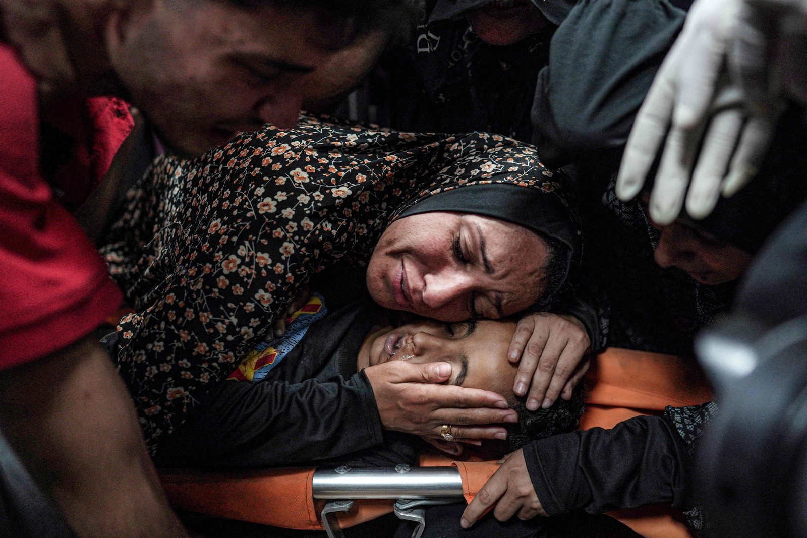 Uma mãe se despede do corpo de seu filho que foi morto após o bombardeio israelense noturno em al-Maghazi,no centro da Faixa de Gaza,no necrotério do hospital dos Mártires de Aqsa em Deir el-Balah,em 25 de junho — Foto: Bashar TALEB / AFP
