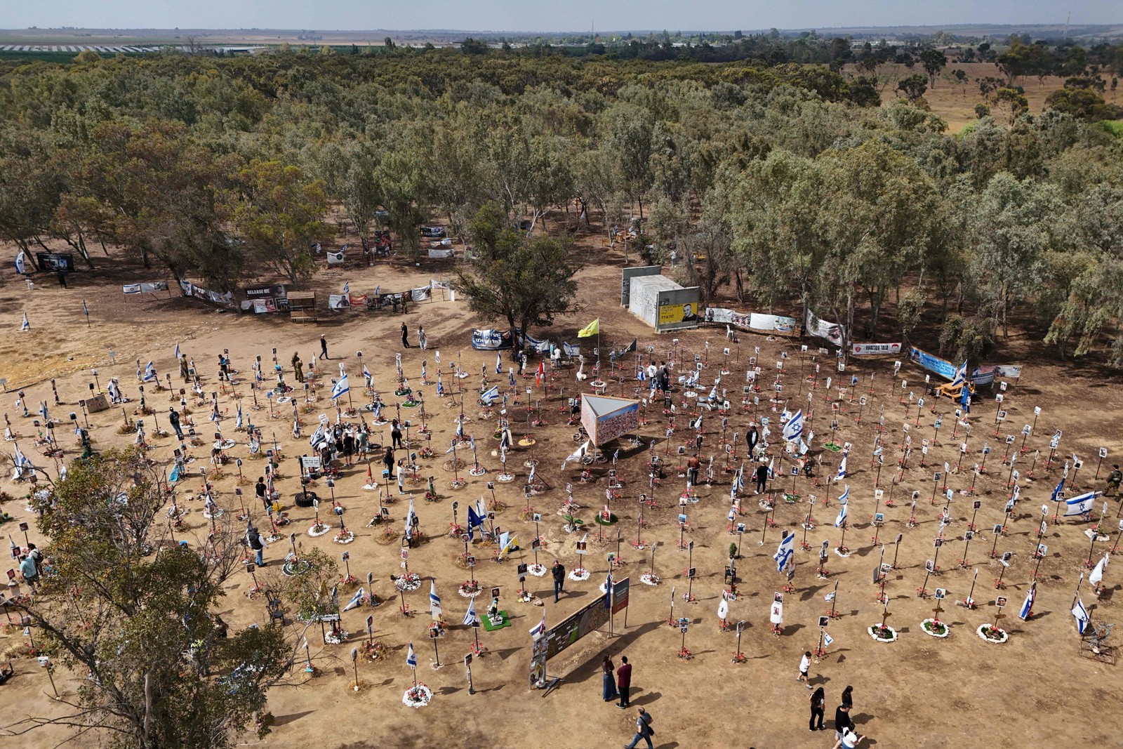 Visitantes caminham em torno de retratos de pessoas que foram feitas reféns ou mortas no ataque do Hamas ao festival de música Supernova em 7 de outubro,no local do festival perto do Kibutz Reim,no sul de Israel,em 13 de maio — Foto: JACK GUEZ / AFP