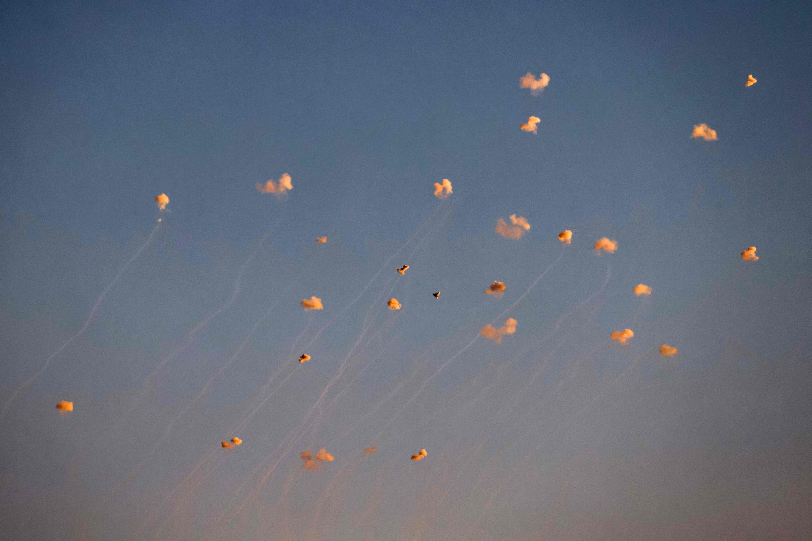 Foguetes disparados do sul do Líbano são interceptados pelo sistema de defesa aérea Iron Dome de Israel sobre a região da Alta Galiléia,em 27 de junho,em meio a tensões transfronteiriças em curso — Foto: Jalaa MAREY / AFP