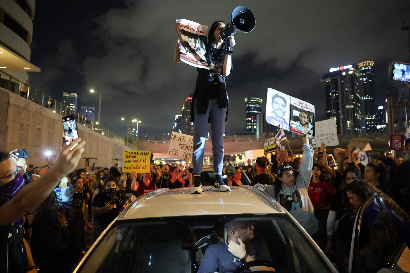 Einav segura uma placa com a foto de seu filho Matan Zangauker,um dos reféns feitos prisioneiros na Faixa de Gaza durante os ataques de 7 de outubro — Foto: JACK GUEZ / AFP