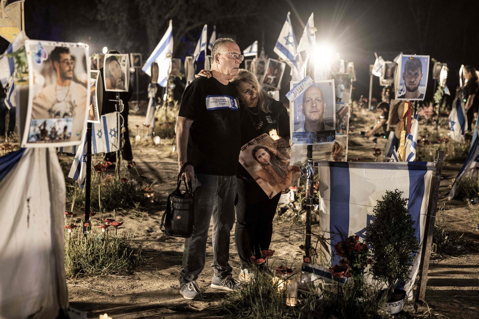 Parentes das vítimas dos ataques de 7 de outubro visitam uma instalação com fotos de seus entes queridos que foram mortos ou sequestrados,no local do festival Nova,em Reim,sul de Israel,em 2 de abril — Foto: MENAHEM KAHANA / AFP