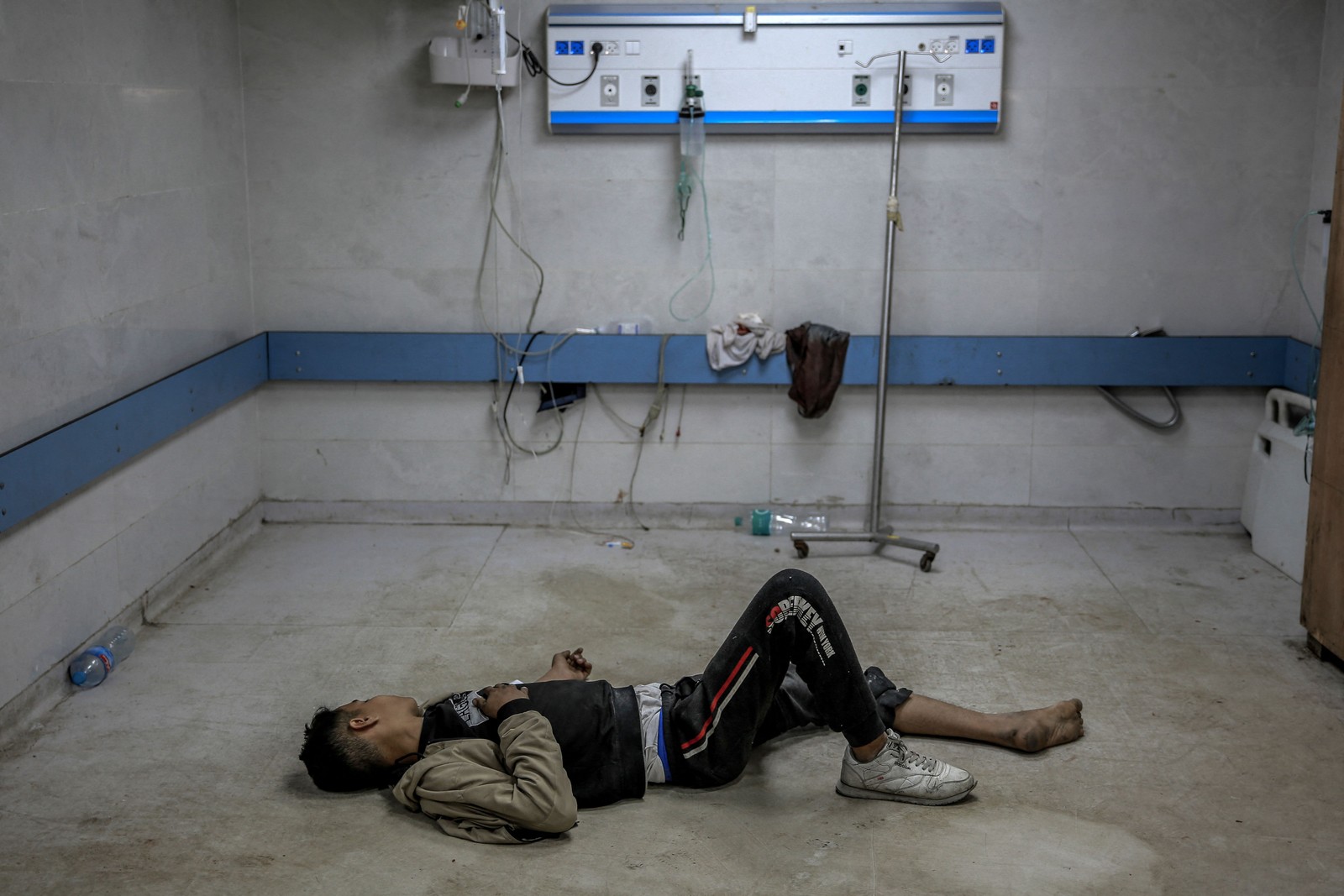 Um jovem palestino ferido no bombardeio israelense deita no chão enquanto aguarda atendimento médico no hospital Al-Shifa,na cidade de Gaza,em 15 de março — Foto: Omar AL-QATTAA / AFP