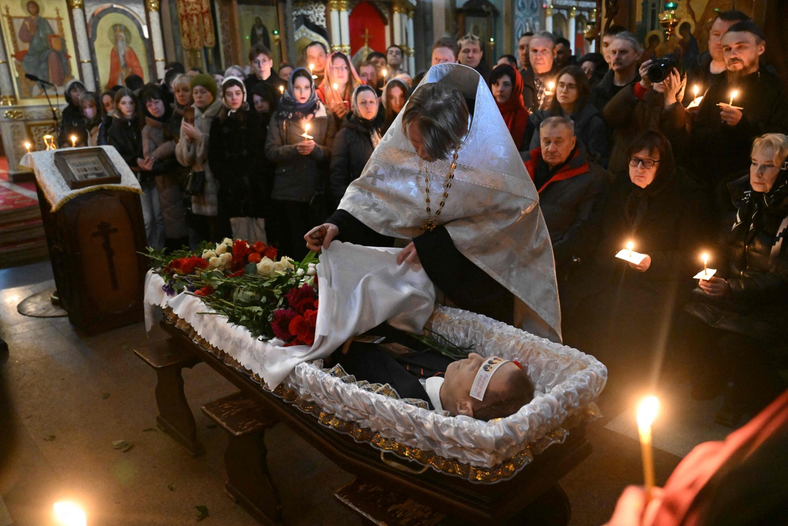 O corpo do líder da oposição russa Alexei Navalny durante o funeral na igreja Mãe de Deus Quench My Sorrows,no distrito de Maryino,em Moscou,em 1º de março — Foto: Dmitry LEBEDEV / Kommersant Photo / AFP