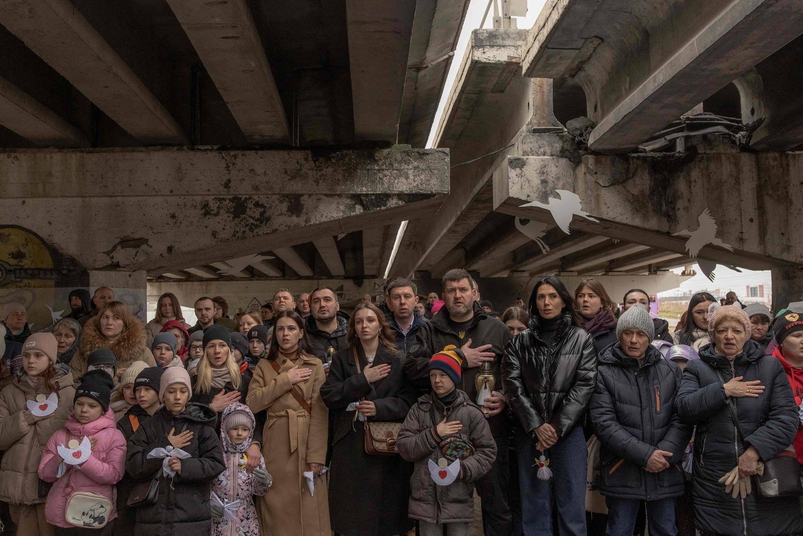 Moradores participam de uma cerimônia memorial sob uma ponte destruída em Irpin,a noroeste de Kiev,em 24 de fevereiro — Foto: Roman PILIPEY / AFP)