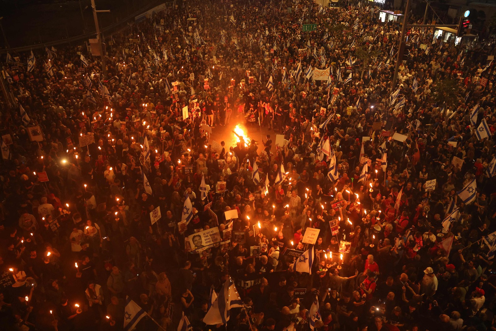 Manifestantes carregam cartazes em frente ao Ministério da Defesa durante uma reunião de parentes de reféns israelenses mantidos em Gaza desde os ataques de 7 de outubro por militantes do Hamas,na cidade costeira israelense de Tel Aviv,em 30 de março — Foto: JACK GUEZ / AFP