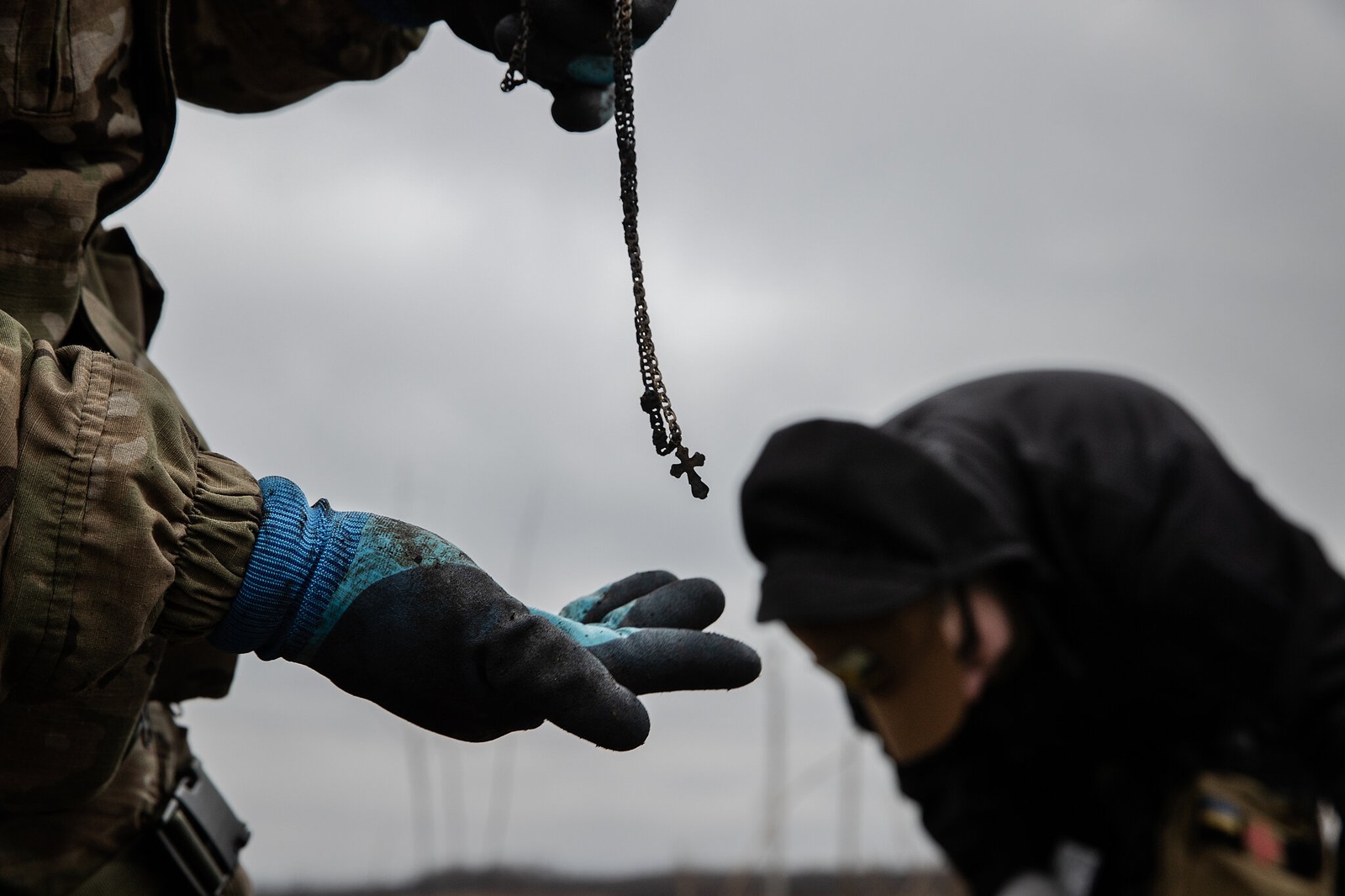 20 de janeiro: um grupo de voluntários civis chamado Platsdarm coletou corpos dos campos sangrentos e vilas devastadas do leste da Ucrânia. Uma cruz em uma corrente foi encontrada no corpo de um soldado russo. — Foto: Tyler Hicks/The New York Times