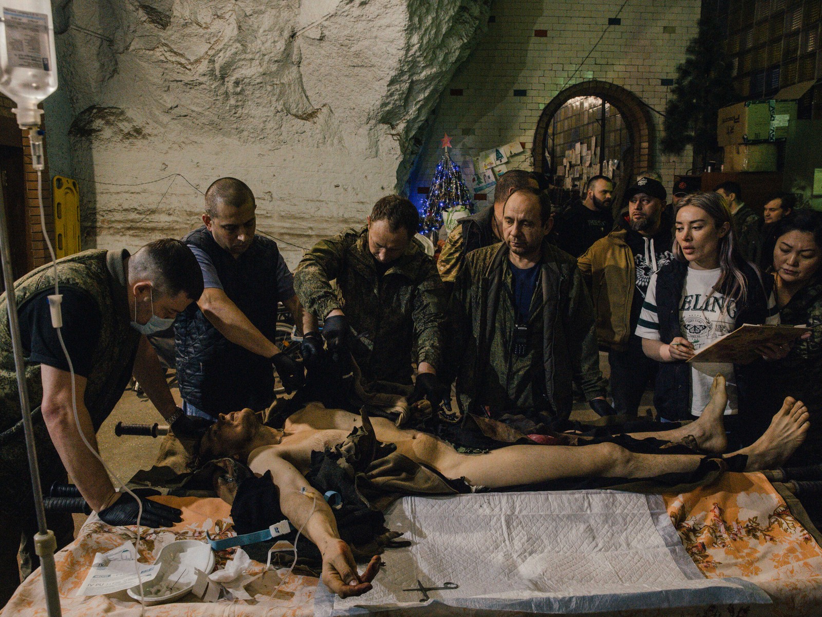 22 de janeiro: Soldados russos feridos sendo tratados perto da linha de frente em um hospital subterrâneo,onde equipes médicas operam em salas montadas em um labirinto de túneis que antigamente serviam como adega. — Foto: Nanna Heitmann para o The New York Times